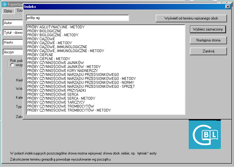 - przeglądanie i wybór terminów z indeksu kontekstowego dla każdego pola